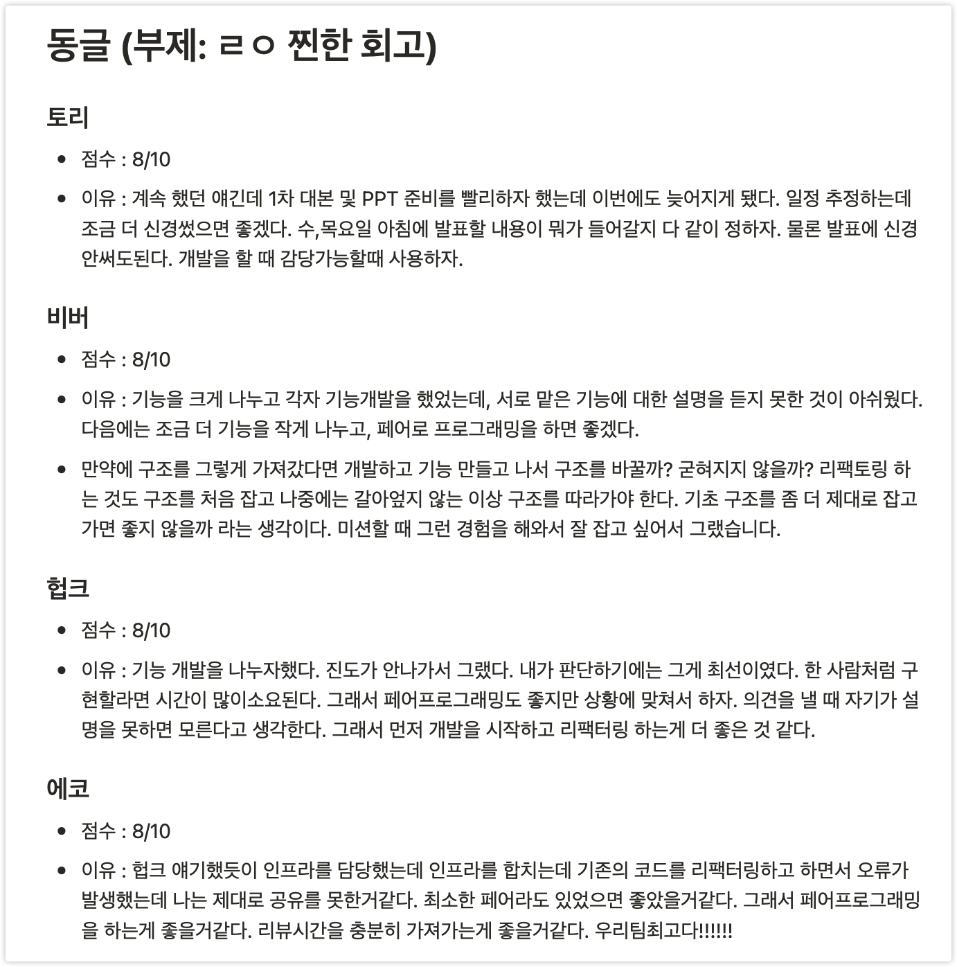 그래서 그 다음주 월요일에 짧게나마 회고를 진행했다.